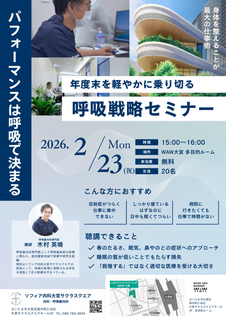 2026年2月23日(月・祝)に、WAW大宮(大宮サクラスクエア)にて「呼吸戦略セミナー」を開催いたします 。呼吸器内科専門医の視点から、春特有のだるさや睡眠の質へのアプローチ、花粉症対策についてお話しします 。また、多忙な方が上手に医療を受け、健やかに年度末を乗り切るためのコツも伝授いたします 。